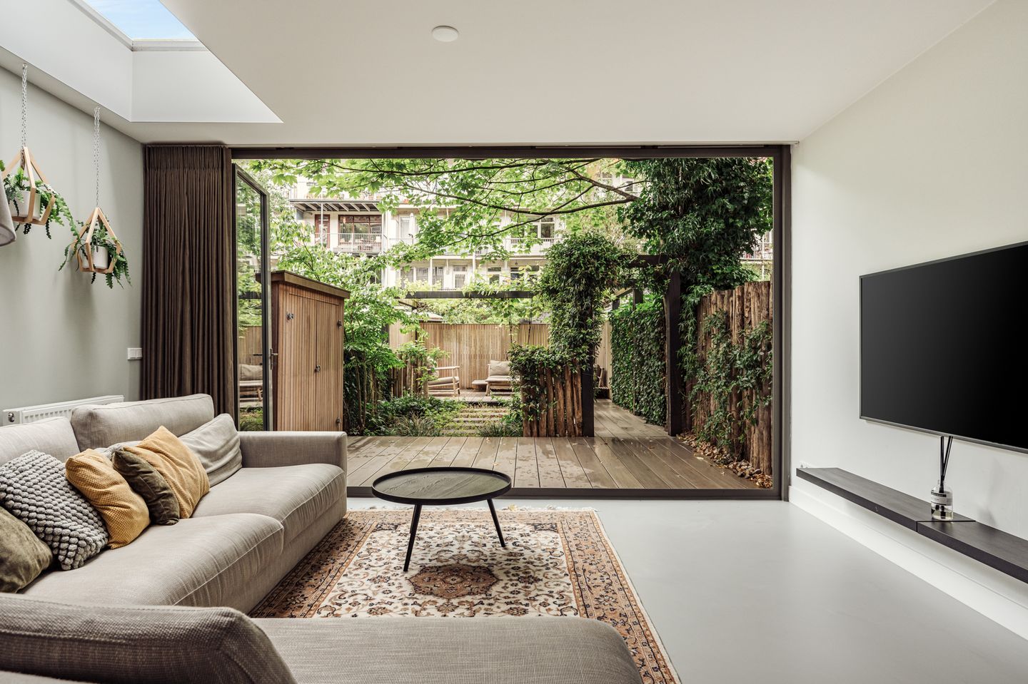Entrance hall with a separate toilet. Wonderfully bright living room with poured concrete flooring, underfloor heating, high ceilings, and a sleek open kitchen with built-in appliances. Large sliding doors spanning the full width open out to the sunny garden of approx. 57 m². An internal staircase leads to the first floor.