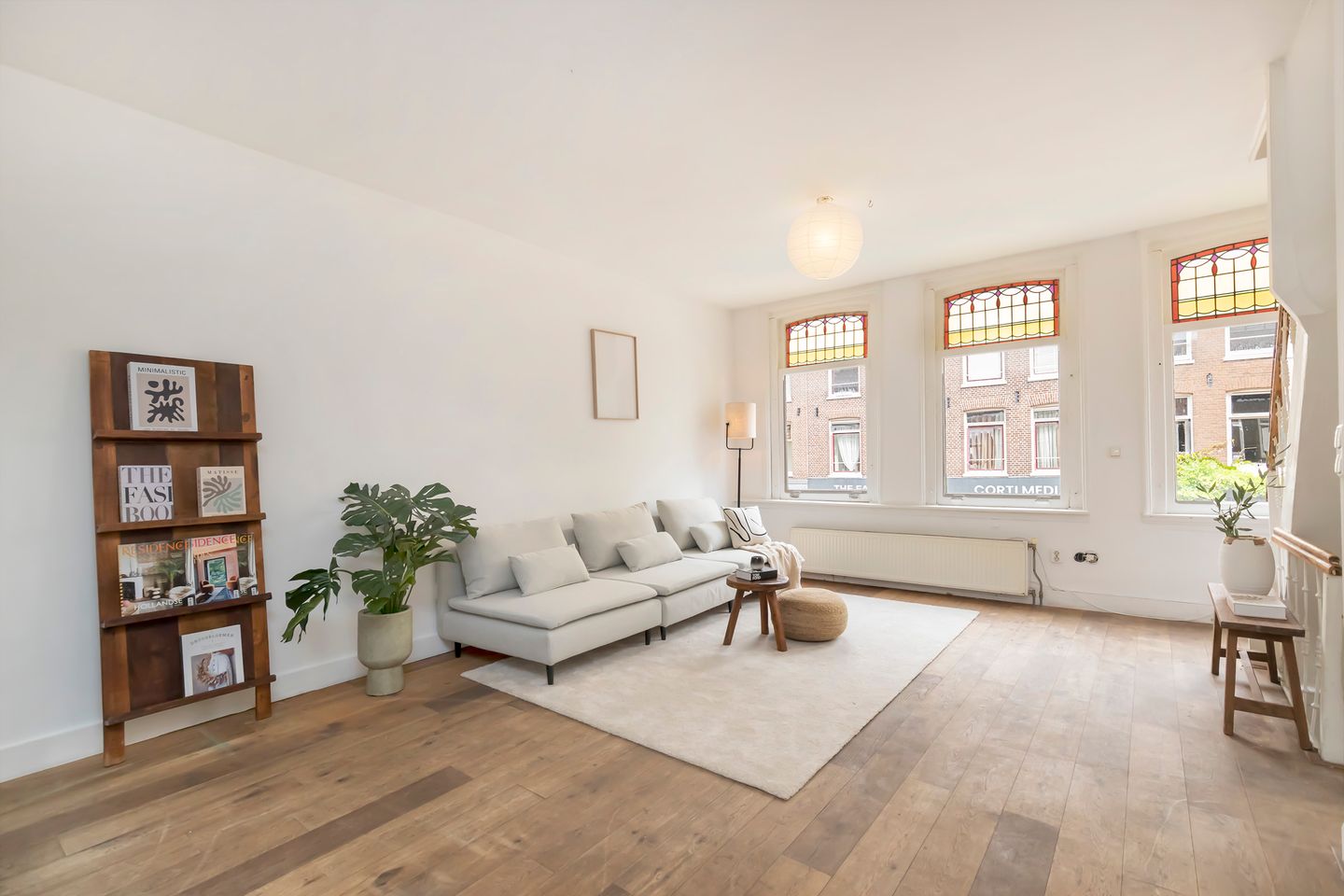 Ruime woonkamer met aan de voorzijde drie grote raampartijen die zorgen voor veel lichtinval. Deze drie raampartijen zijn ook (op elke verdieping) voorzien van mooie authentieke glas in lood bovenramen. De keuken was aan de achterzijde gelegen, met een deur naar het platte dak dat in gebruik is als terras.