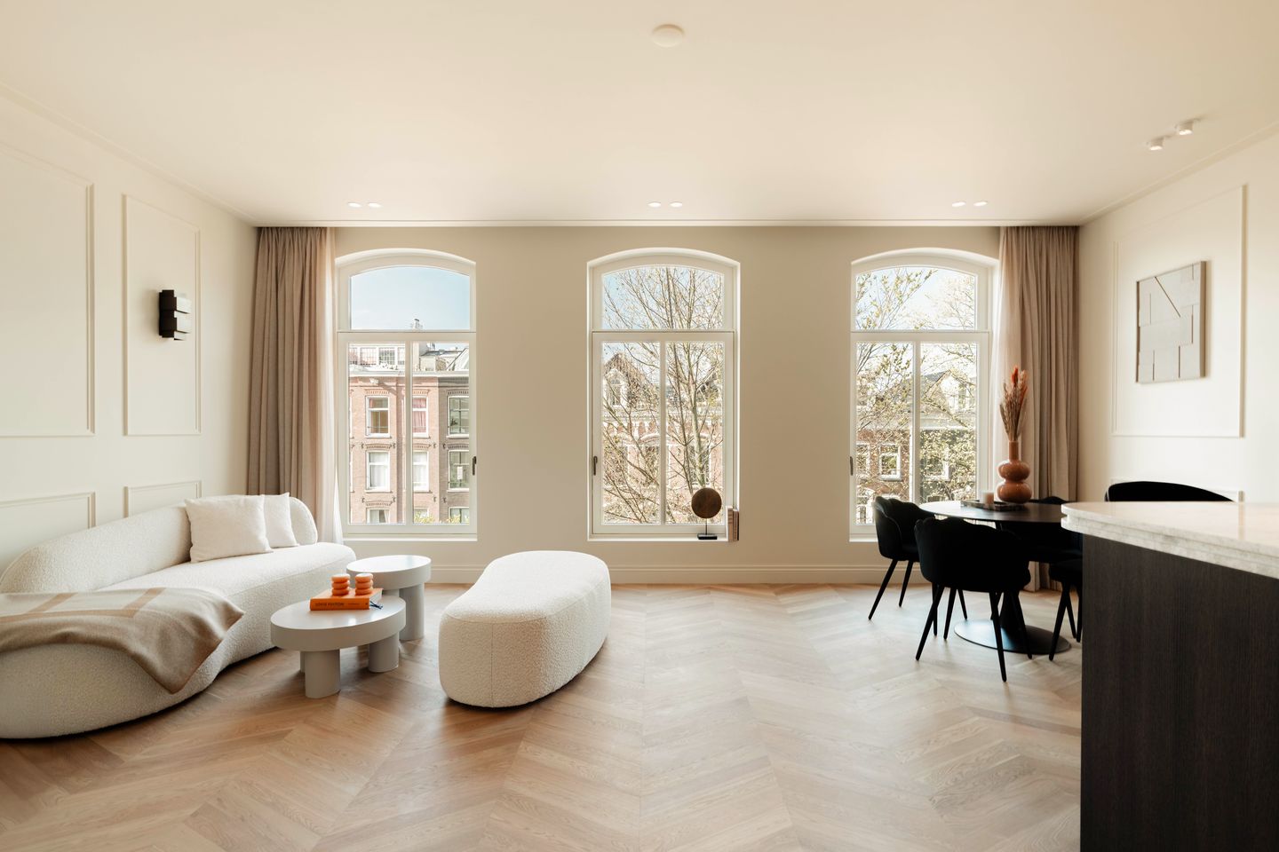 - De royale living is gelegen aan de voorzijde, waar de grote ramen direct de aandacht trekken en zorgen voor veel natuurlijk lichtinval;