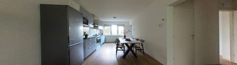 De woonkamer bevindt zich aan de achterzijde van de woning en vormt het hart van het huis. Dankzij de grote ramen komt er veel natuurlijk licht naar binnen en heb je een fijn uitzicht op het groen aan de achterzijde. De ruimte is royaal opgezet en biedt meer dan genoeg plek voor een grote bank, een gezellige zithoek en eventueel een extra lees- of werkhoek. Hier kun je heerlijk ontspannen na een lange dag. Vanuit de woonkamer is er toegang tot het balkon, waar je in alle rust kunt genieten van de buitenlucht. Grenzend aan de woonkamer ligt het eetgedeelte, met volop ruimte voor een grote eettafel waar familie en vrienden kunnen aanschuiven. De open keuken sluit hier mooi op aan en is goed ingedeeld, voorzien van diverse inbouwapparatuur en voldoende kastruimte. Zo kun je tijdens het koken toch in contact blijven met je gezelschap in de woonkamer en het eetgedeelte, ideaal voor wie van gezelligheid houdt.