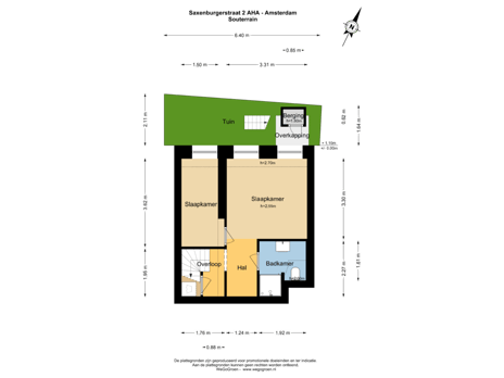 - 14 m² (2,11 meter diep en 6,40 meter breed)