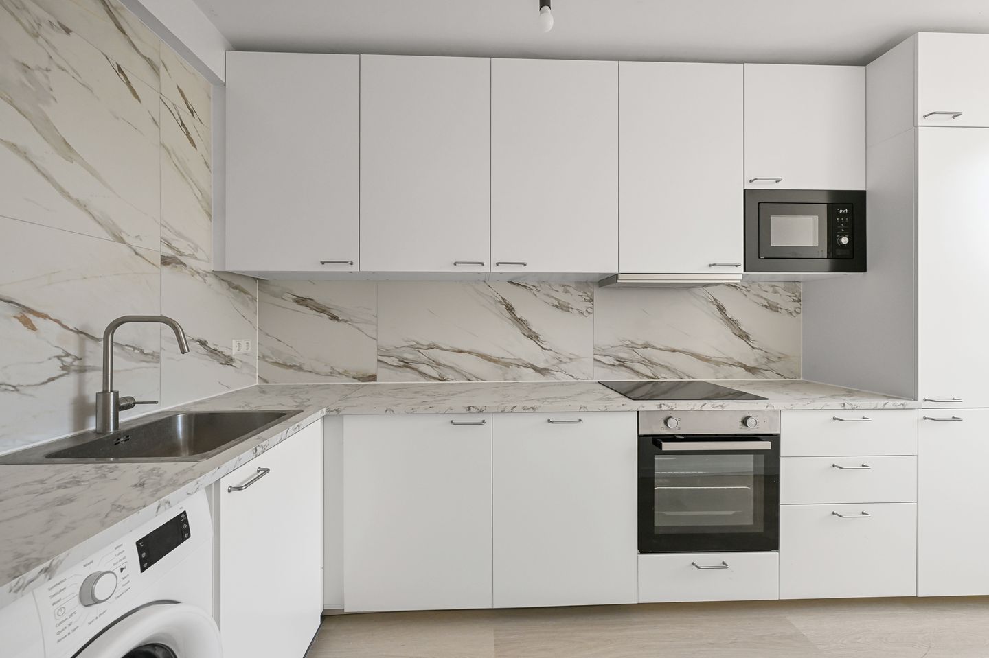 Nieuwe keuken met inbouwapparatuur (vaatwasser, magnetron, oven, 4-pits inductiekookplaat, afzuigkap met koolstoffilter, koel- en vries combinatie en wasmachine.