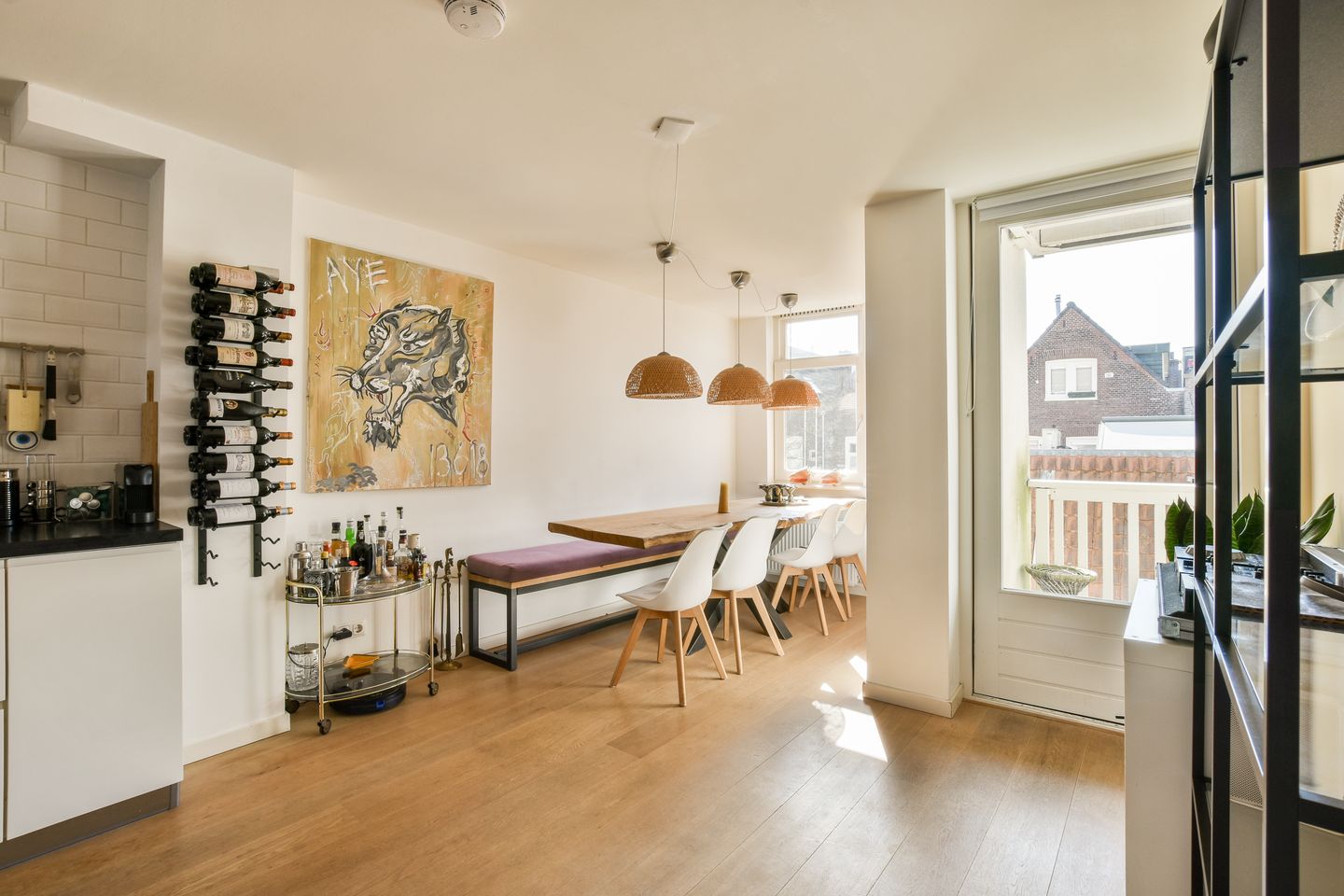 Aan de achterzijde ligt de zonnige eetkamer met toegang tot het balkon op het zuidwesten – een intieme buitenruimte waar tot in de avond van de zon genoten kan worden. Aangrenzend bevindt zich een praktische berging met wasmachineaansluiting.