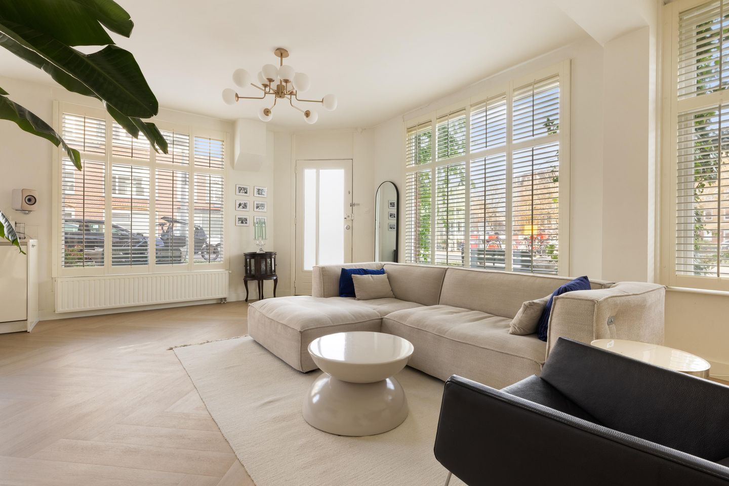 Living on the Sloterkade means open views, tranquillity and an abundance of light. This corner house sits directly on the Schinkel, so the neighbours opposite are far away and light enters from three sides. The building was once a small cigar shop, which explains the expansive glazing; on sunny days you can watch the boats glide by. From here you can walk to the Vondelpark in just a few minutes and you’re close to Oud-Zuid, while on-street parking is plentiful, including electric charging points. In front of the house is a city garden that wraps around the corner, ensuring a sunny spot at any time of day. Yes — evening sun for aperitif hour too!