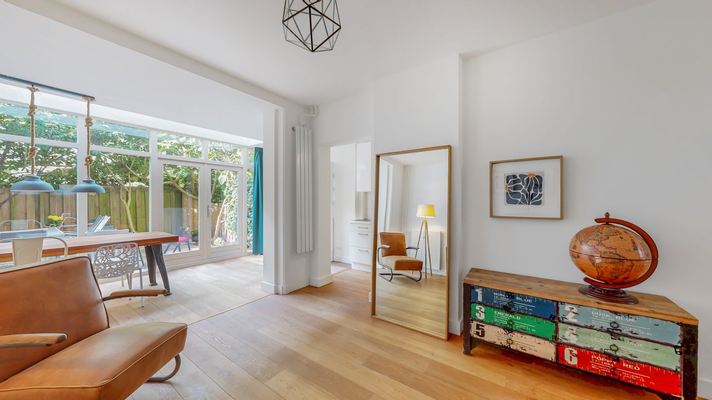 - riante woonkamer met openslaande deuren naar de tuin
