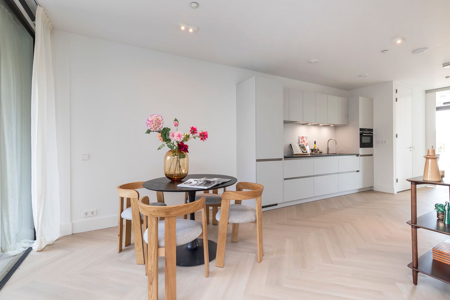 This 2-bedroom apartment features a bright, L-shaped living room with an open-plan kitchen and access to the balcony. The centrally located kitchen offers ample storage space and is equipped with various built-in Siemens appliances, including a dishwasher, combi oven, induction hob, fridge/freezer combination, and of course, a Quooker boiling water tap.