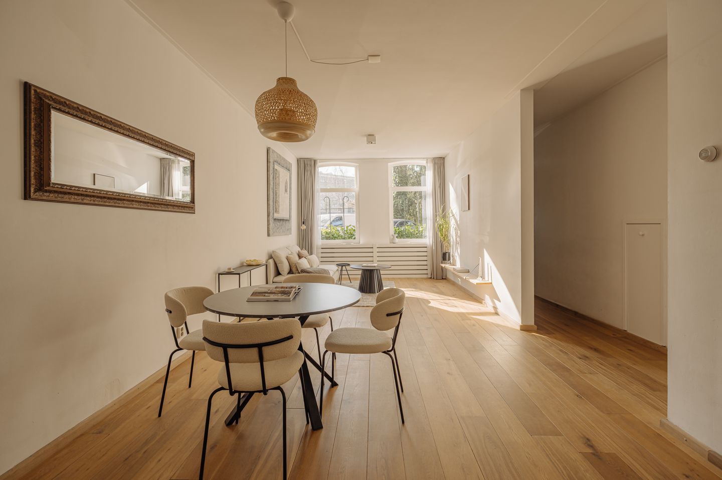 Door de gehele woning ligt een nette eikenhouten lamel parketvloer.