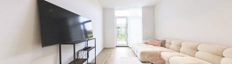 De woonkamer ligt aan de groene achterzijde en biedt een prettig loungegedeelte met veel daglicht dankzij de hoge ramen. De strak gestuukte en geschilderde wanden en plafonds zorgen voor een moderne look. Omdat het een doorzonwoning is, geniet je de hele dag van natuurlijke lichtinval. Vanuit de zithoek kijk je uit op de groene binnentuin. Via de achterdeur stap je op het zonnige terras (zuidwesten) – een heerlijke plek om rustig te ontspannen, met uitzicht op het gezamenlijke groene hof.