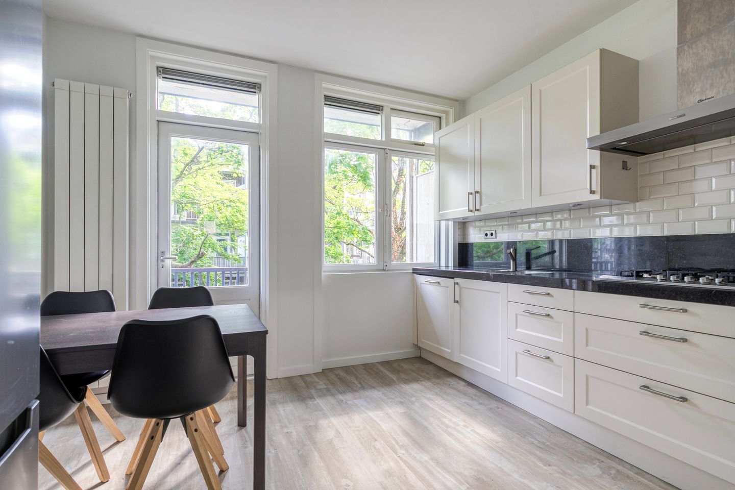 De L-vormige open keuken is heerlijk ruim en licht. Er is voldoende ruimte om een eettafel te plaatsen en er is een deur naar het balkon.