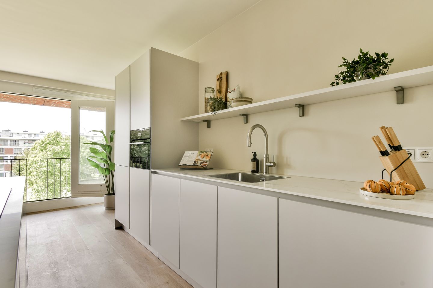 Entree, hal, zeer ruime doorzon woonkamer met luxe open keuken met kookeiland en bargedeelte. Aan deze keukenbar is het heerlijk borrelen met vrienden of voor een gezellig ontbijt. De woonkamer is zo groot dat er voldoende ruimte is voor een eethoek en zithoek en het is er heerlijk licht door de grote raampartijen. Vanuit de achterzijde van de woning (met Franse balkons) heb je een prachtig vrij uitzicht zicht op het parkje achter het complex. Hier kan je genieten van de middag- en avondzon.