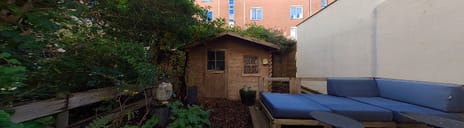 Finally, there’s the garden, a true extension of the living space. There’s plenty of room for a lounge set and dining table, making it the perfect spot for outdoor relaxation or dining. At the back stands a wooden storage shed, ideal for bicycles, garden tools, or extra storage.