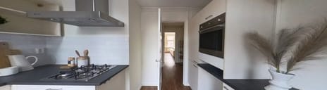 De keuken is aan de achterzijde van de woning gesitueerd en is voorzien van diverse inbouwapparatuur, waaronder een koelkast, vriezer, gasfornuis en combi oven-magnetron, evenals een aansluiting voor de wasmachine. Vanuit de keuken heeft u toegang tot het balkon, een fijne plek om buiten te zitten.