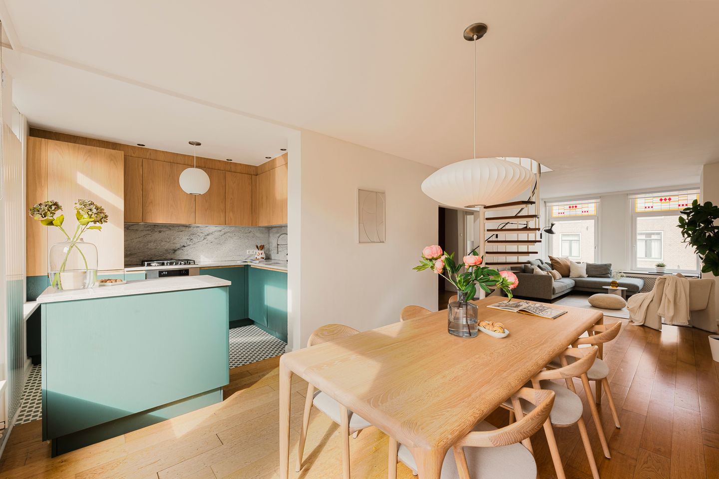 Private entrance from the ground floor with stairwell. Spacious hallway with toilet and access to the study/bedroom at the front. In the large living area, the fireplace and oak floor immediately stand out. The sitting and dining areas are integrated and extend across the full length of the property. The spiral staircase to the attic floor is located in the living room. The open kitchen is at the rear and equipped with various built-in appliances.
