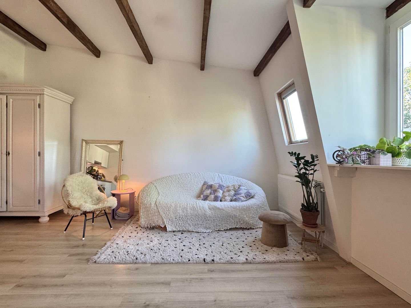 In 2010 the structural shell and foundation were renewed, and all apartments were officially divided. The apartment itself underwent a comprehensive renovation in 2015, during which all installations, finishes, and interior elements were modernised to contemporary standards. Since then, it has been meticulously maintained: in 2024, the roof’s top layer was renewed and additional insulation material (100mm PIR) was installed underneath, significantly improving both durability and energy performance. Furthermore, most of the façade painting work was refreshed in 2025, including the internal staircase and corridor areas. As a result, the building is currently in excellent overall condition. Inside, the apartment is filled with natural light and rich in character, featuring high ceilings with exposed wooden beams and three large windows overlooking the Dutch Central Bank and the surrounding greenery. With its Energy Label A, this home performs exceptionally well in terms of energy efficiency – a rare feature for a top-floor apartment in a heritage building.