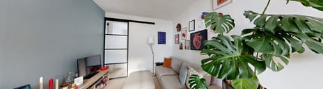 Op de tweede verdieping stap je binnen in de lichte en gezellige woonkamer met een Frans balkon op het zuiden. De hoge ramen van vloer tot plafond geven de ruimte een open en ontspannen sfeer.