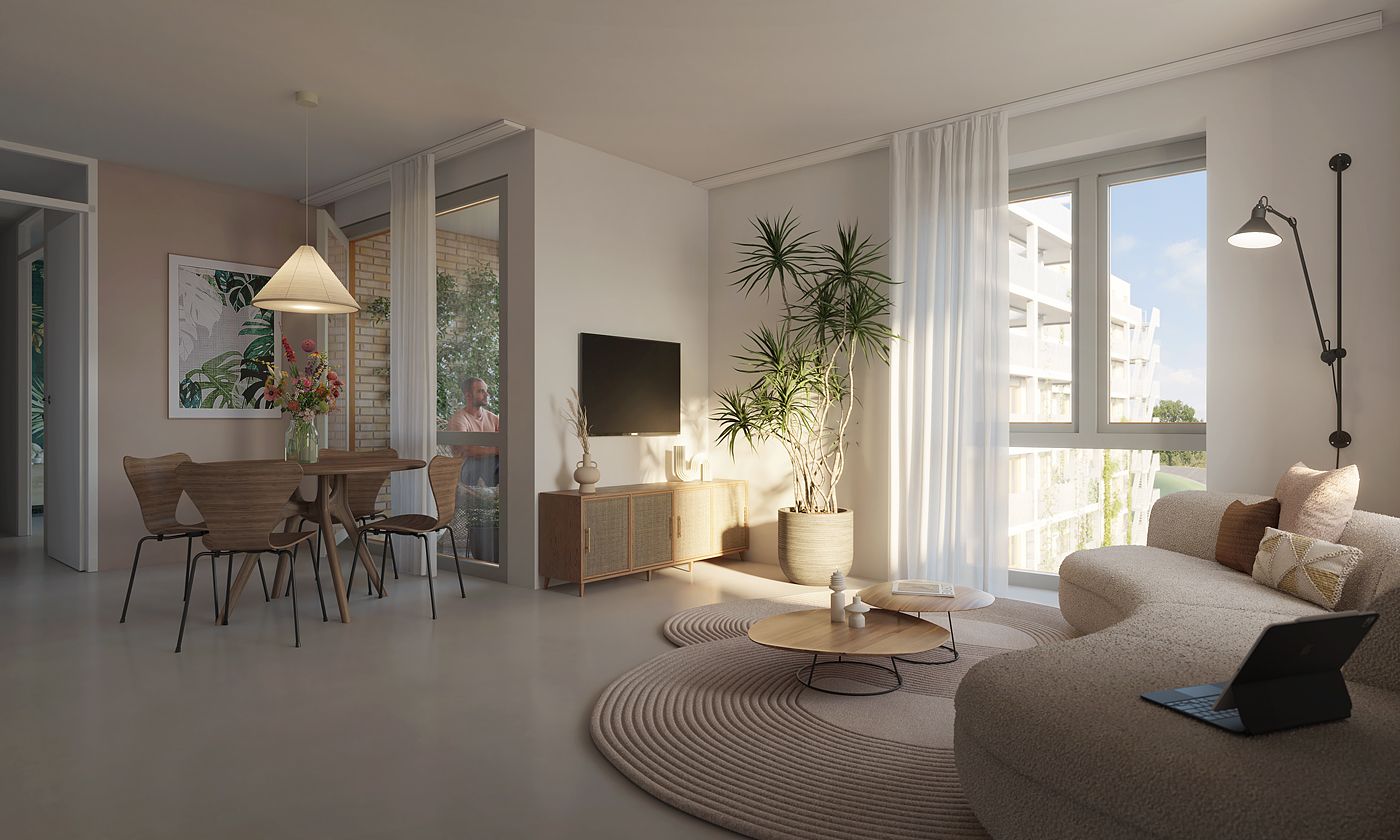 Deze type B2-appartementen liggen op een hoek en zijn circa 67 m2 groot. Ze beschikken over een fijne living met een moderne keuken en een badkamer met mooi sanitair en tegelwerk. Vanuit de living stap je zo je eigen buitenruimte op. En als extra pluspunt heb je als bewoner toegang tot de gezamenlijke daktuin: een groene plek om te ontspannen en te genieten van het uitzicht over de buurt. En daarnaast is er nog een natuurtuin boven het parkeerdek.