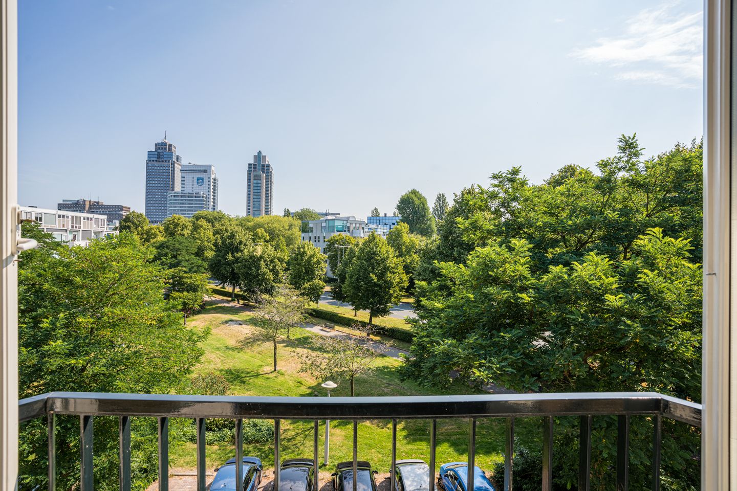 Eerste woonlaag: Bij binnenkomst staat u direct in een lichte woonkamer met een erker en grote ramen aan de voorzijde, wat zorgt voor een ruimtelijk gevoel. Aan de achterzijde geven openslaande deuren toegang tot een balkon op het zuiden, waar u kunt genieten van de avondzon, met een opbergkast en uitzicht op de binnentuinen.