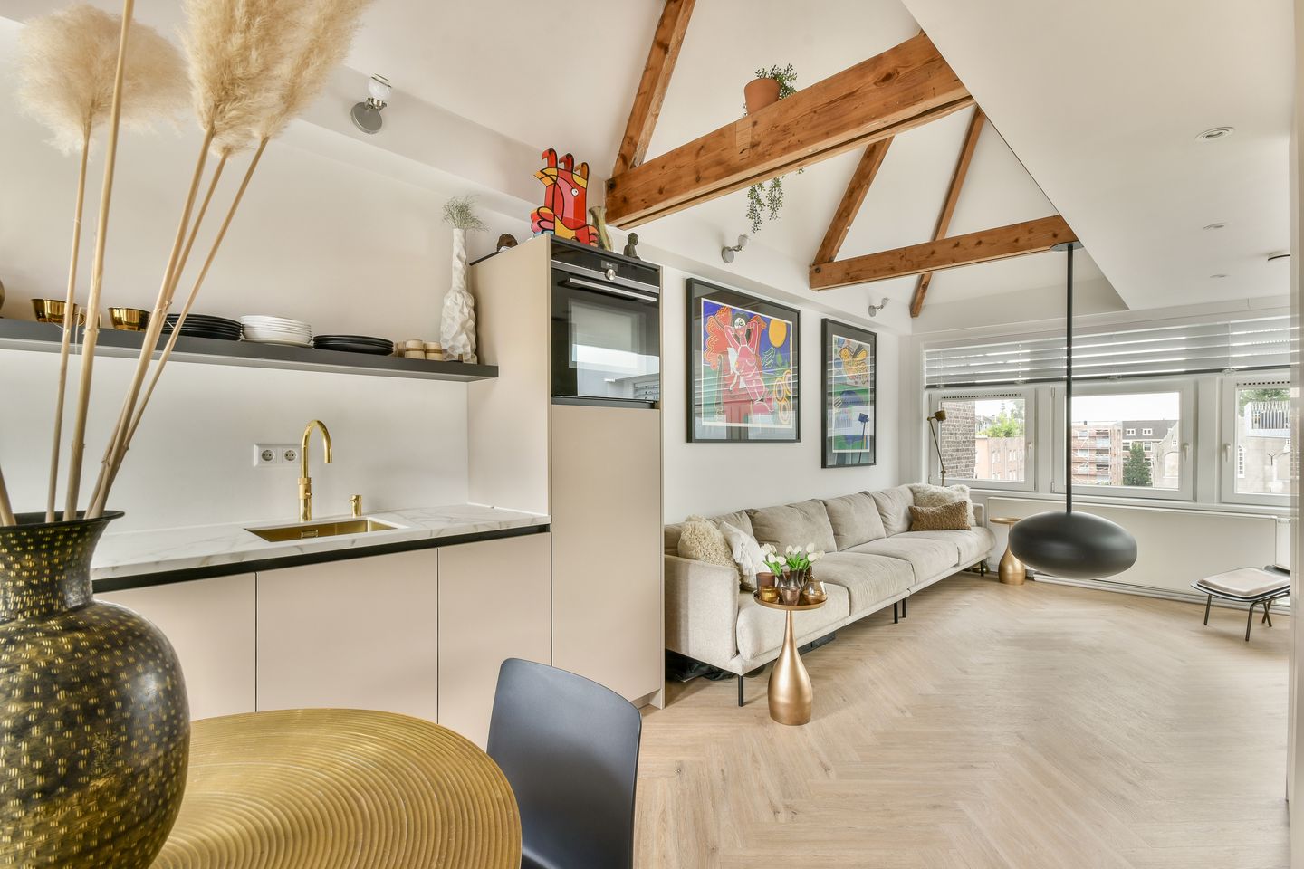De open keuken is nieuw en in luxe uitgevoerd. De kastfronten zijn taupe kleurig. de keukenkasten hebben laden, wat zorgt voor veel bergruimte. Het composieten keukenblad biedt veel werkruimte. Natuurlijk is deze keuken uitgerust met alle moderne inbouwapparatuur, zoals een vaatwasser, een koel/vriescombinatie, een inductiekookplaat van Bora met geïntegreerd afzuigsysteem, een kraan van Quooker en een combimagnetron. Hier is plek voor een eettafel en de grote ramen aan de keukenzijde geven de woning een mooi doorzon effect.