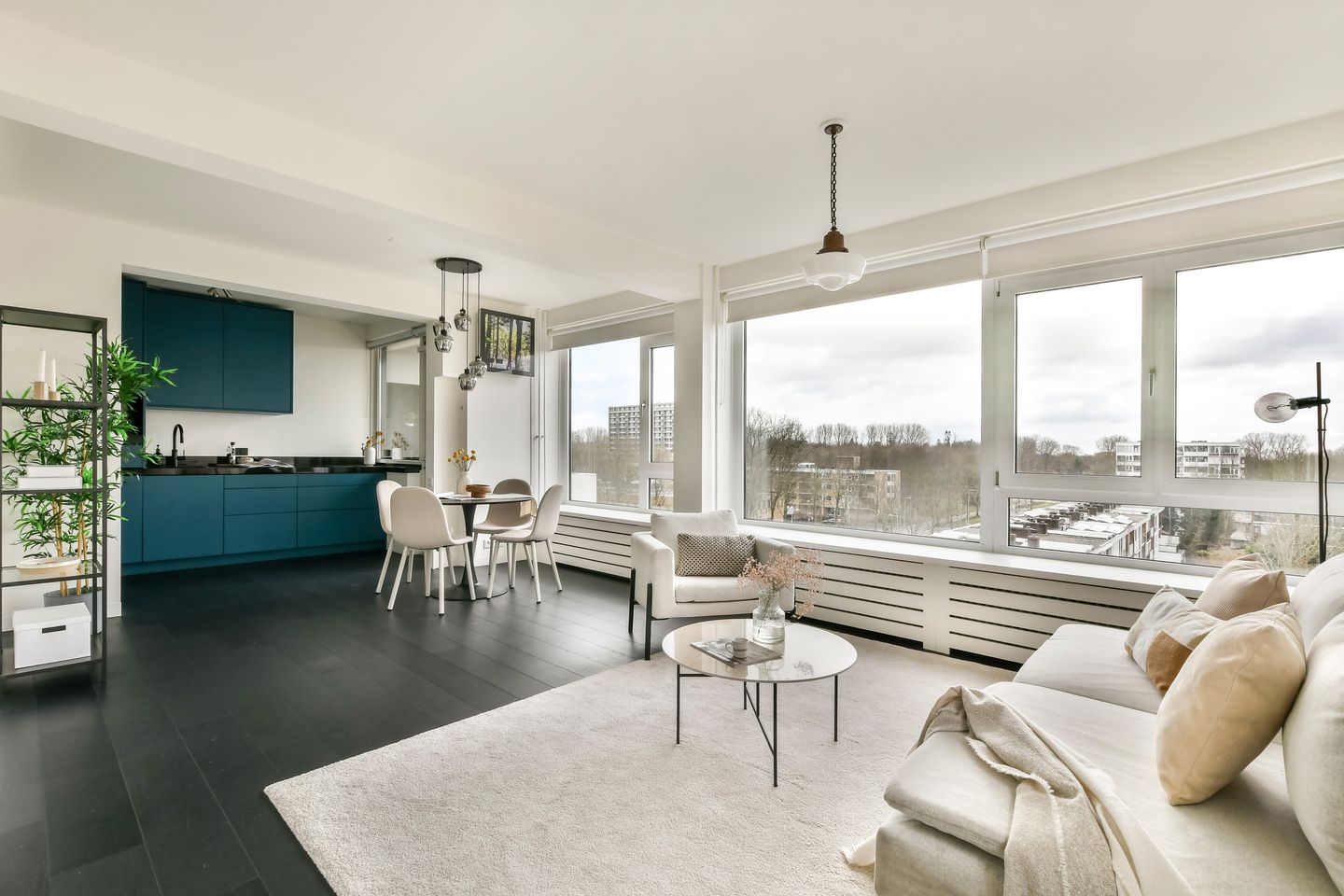 Bij binnenkomst stap je in een ruime hal die toegang biedt tot de woonkamer en het toilet. De lichte woonkamer met moderne open keuken is voorzien van grote raampartijen, waardoor er veel daglicht binnenvalt en de ruimte een open en ruimtelijk gevoel heeft. Bovendien geniet je hier van een fraai uitzicht, wat zorgt voor een prettige rust midden in de stad. De keuken uit 2023 is hoogwaardig uitgevoerd en voorzien van luxe inbouwapparatuur, waaronder een stoomoven, een Miele-vaatwasser, een inbouwkoelkast, een inbouwvriezer, een Quooker voor kokend en bruisend water en een inductiekookplaat met geïntegreerde afzuiging van Miele. De woonkamer met open keuken beschikt daarnaast over een airconditioning met verwarmingsfunctie. Vanuit de woonkamer heb je toegang tot een van de twee balkons, gelegen op het oosten, een heerlijke plek om ’s ochtends te genieten van een kop koffie.