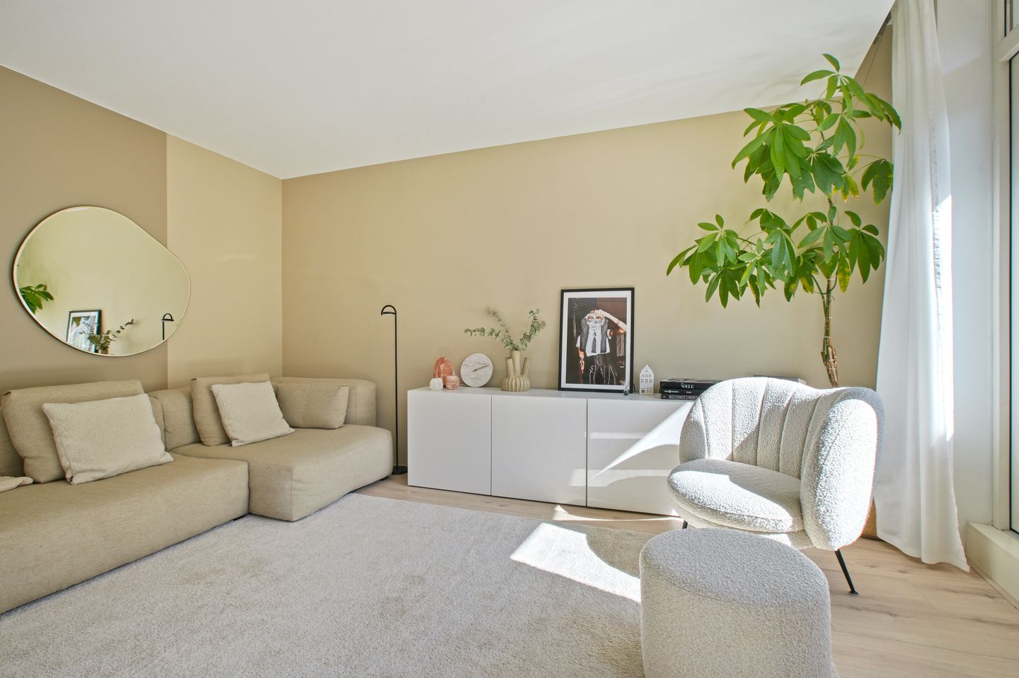 De ruime woonkamer aan de achterzijde van de woning vormt het centrale punt en laat door de oriëntatie op het zuiden en de grote ramen een overvloed aan natuurlijk licht binnen. De directe verbinding met de moderne open keuken maakt sociale interactie gemakkelijk en biedt een perfecte setting voor een gezellige avond. Vanuit de woonkamer is er directe toegang tot het vernieuwde (2024) zonnige balkon op het zuiden.