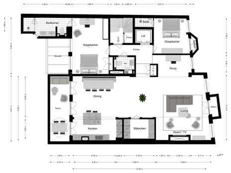 Deze informatie is door ons met de nodige zorgvuldigheid samengesteld. Onzerzijds wordt echter geen enkele aansprakelijkheid aanvaard voor enige onvolledigheid, onjuistheid of anderszins, dan wel de gevolgen daarvan. Alle opgegeven maten en oppervlakten zijn slechts indicatief. De Meetinstructie is gebaseerd op de NEN2580. De Meetinstructie is bedoeld om een meer eenduidige manier van meten toe te passen voor het geven van een indicatie van de gebruiksoppervlakte. De Meetinstructie sluit verschillen in meetuitkomsten niet volledig uit, door bijvoorbeeld interpretatieverschillen, afrondingen of beperkingen bij het uitvoeren van de meting.
