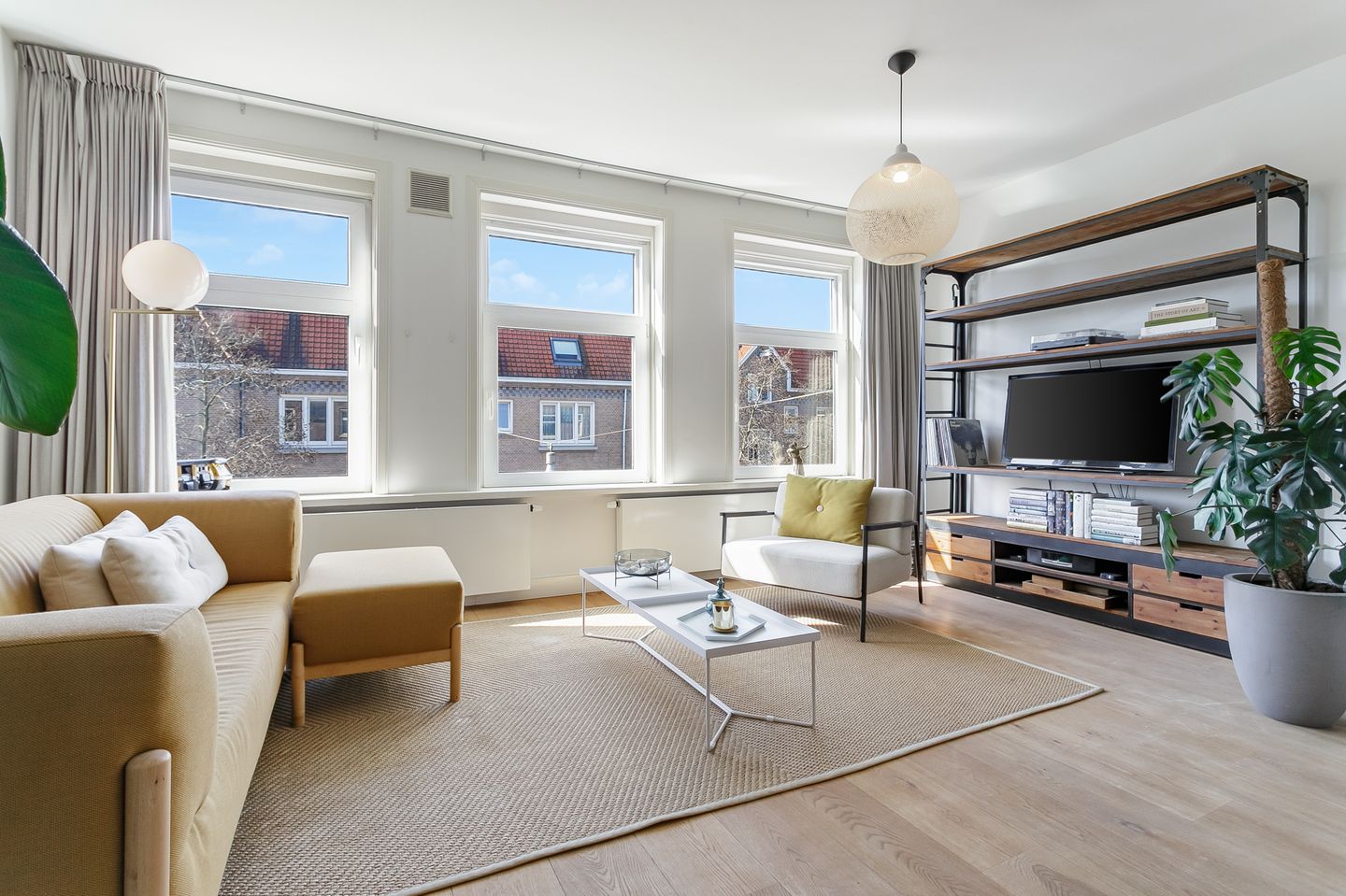 Derde verdieping: Meteen valt op hoe licht dit huis is met drie grote ramen in de voorgevel die de zon de kamer in laten stromen. De zithoek strekt zich uit over de volle breedte van het pand en leent zich uitstekend om met vrienden te borrelen of met het gezin knus voor de televisie te hangen. Ook is er ruimte voor een flinke eettafel om met vrienden en familie aan te eten.