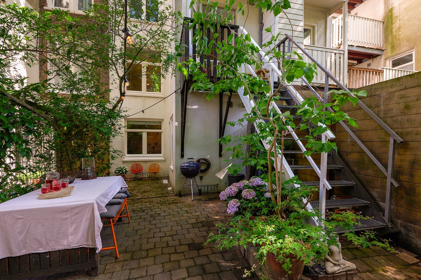 Via de hardstenen trap is de woning zowel op de begane grond als op de eerste verdieping te betreden. De exceptioneel ruime hal op de begane grond biedt plaats voor een goede garderobe en heeft een strak witte houten trap naar bovengelegen woonverdieping. Deze doorzon gelegen kamer heeft het zitgedeelte aan de voorzijde en de woonkeuken aan de achterzijde. De zitruimte beschikt over een fraaie schouw en biedt plaats voor een grote bank en een extra knus zitje aan het venster. De zitkamer loopt naadloos over in de gezellige woonkeuken. In het midden van de verdieping is het separate toilet gelegen. Met de geboden oppervlakte kan men hier met gemak een 8-persoons eettafel plaatsen. De keuken zelf bevindt zich geheel aan de achterzijde en is uitgevoerd met mat witte kasten/lades met een RVS greep en een houtlook werkblad. Voorts is de keuken grotendeels voorzien van inbouwapparatuur en een losse grote Smeg koelkast. Vanuit de keuken is het knusse terras te bereiken, een ideale plek voor een ochtend koffietje, vanwaar de lange trap naar ondergelegen tuin leidt, tevens toegankelijk vanaf de begane grond. De beschut gelegen tuin van 35m² is west georiënteerd en is volledig van klinkers voorzien.