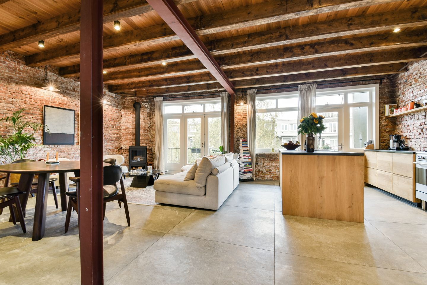 The living room is a light and open space with a ceiling height of no less than 2.90 meters. The space has an ideal size, allowing for various layouts. In addition, it is wonderful to relax by the wood stove. The living room flows seamlessly into the modern open kitchen with a spacious island. The kitchen is finished with beautiful wooden cabinets and a black worktop and has sufficient work and storage space. In addition, there are high-quality built-in appliances, including a Smeg stove with oven and a Quooker.