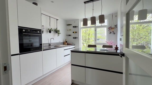 Enjoy spending time to the fullest with family and friends in this beautifully spacious kitchen diner, positioned at the rear with a view of Amsterdam's back gardens. The kitchen island features a 4-burner gas stove with down-suction extraction (Bora) and a cozy bar area. The other built-in appliances can be found in the wall-mounted kitchen unit: a tall fridge-freezer, combination microwave oven, dishwasher (all with 2.5 years of warranty remaining), and the washing machine (7 years warranty remaining) is neatly concealed in one of the kitchen cabinets. Furthermore, there are centrally positioned wall sockets for great convenience and wall racks for fine bottles of wine and other decorations. The kitchen offers plenty of storage space in the white cabinets with drawers for pots, pans, crockery, and cutlery, while the spacious composite countertop provides ample workspace.