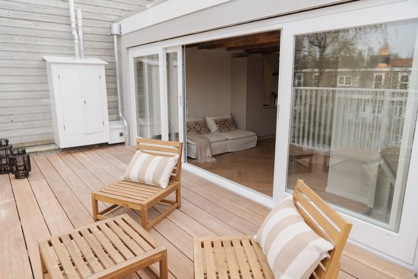 - de glazen schuifpui aan de achterzijde kan volledig open voor toegang tot het royale dakterras van ca. 15 m²