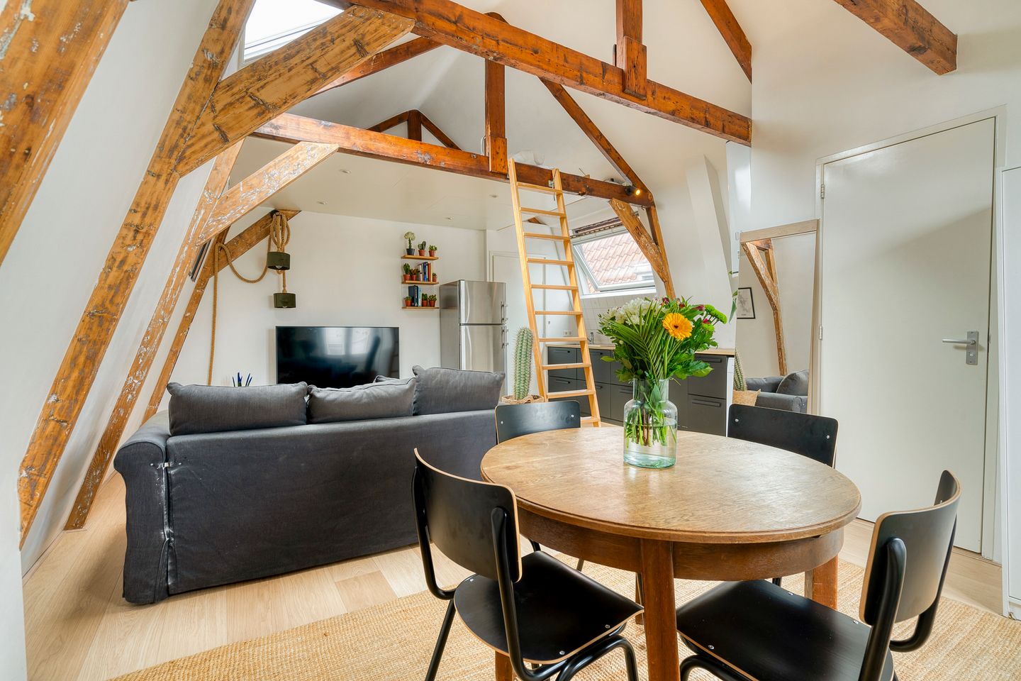 This well-designed studio apartment of approximately 26 m², with an additional mezzanine of 6 m² gross floor area, was completely renovated in 2021. It is located just a few meters from the popular Oosterpark and the lively Dappermarkt. With its beautiful roof structure, modern kitchen and bathroom, and abundant natural light, this is the perfect base in one of the city’s most charming neighborhoods.