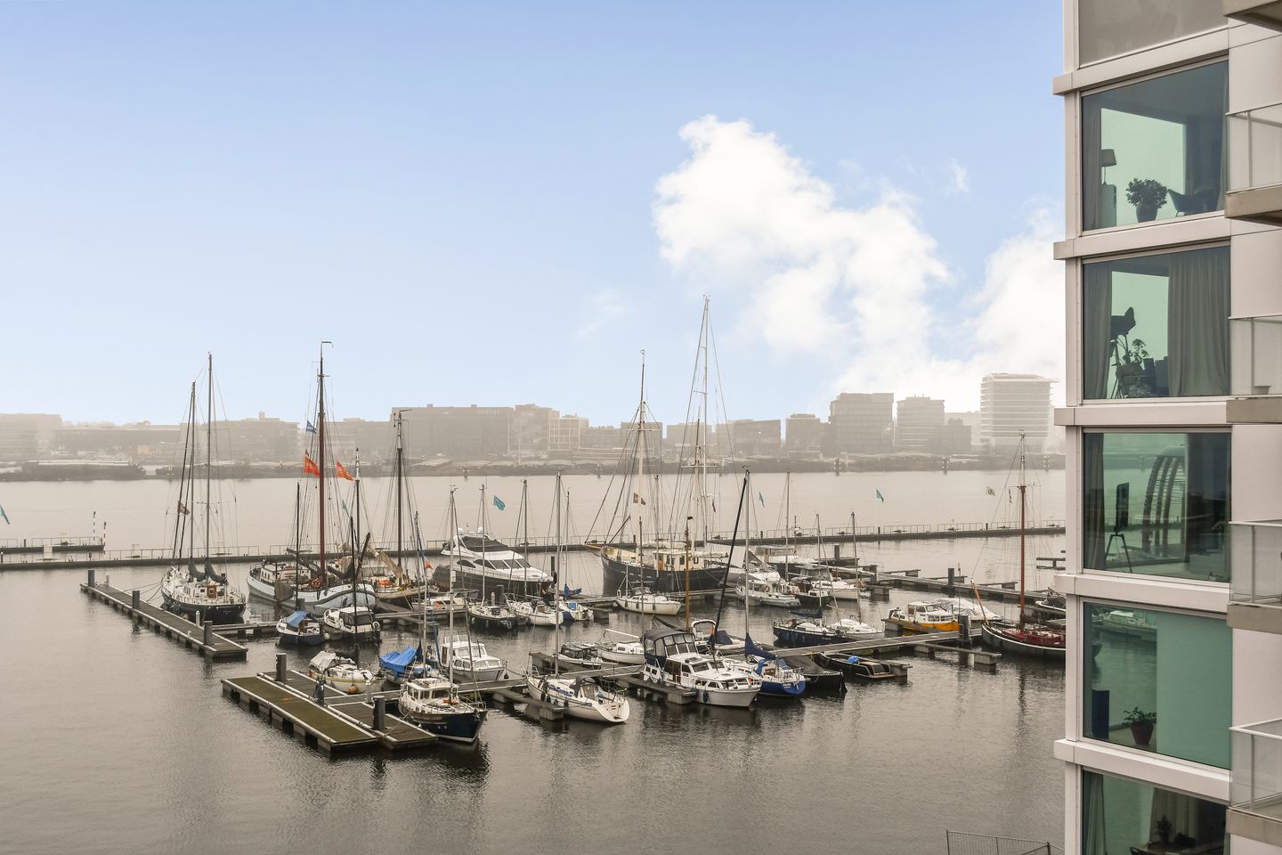 Aan de achterzijde bevindt zich de ruime woonkamer met open keuken. De woonkamer biedt voldoende ruimte voor een comfortabele zithoek en een eethoek. Door de grote ramen geniet je hier het hele jaar door van veel licht. De keuken dateert uit 2025 en is uitgerust met moderne inbouwapparatuur. Via de woonkamer heb je toegang tot het balkon, gelegen aan de achterzijde van de woning, met fantastisch uitzicht op de haven en het IJ. Perfect voor de zomerdagen.