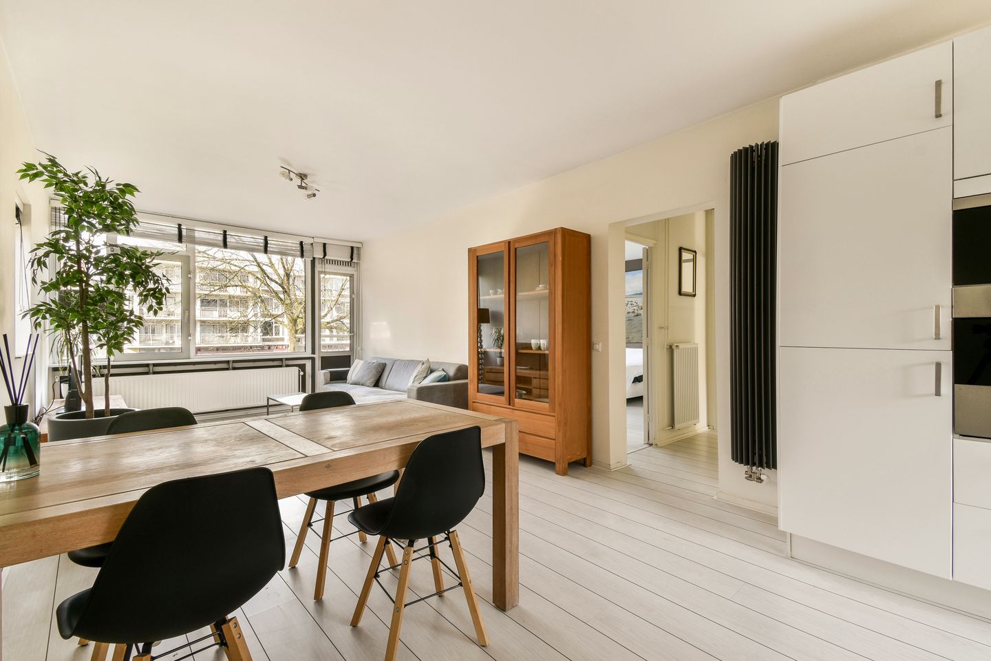 The generous living room offers ample space for a cozy dining area and a comfortable sitting area. Thanks to the corner location, you can enjoy an unobstructed view of A.J. Ernststraat, creating a sense of spaciousness and extra natural light. From the second hallway, you can access the two bedrooms and the bathroom. The spacious master bedroom at the rear, originally consisting of two rooms, provides direct access to the sunny southwest-facing terrace, where you can relax until late in the afternoon. The second bedroom at the front is also bright and spacious, perfect as a guest room or home office. The apartment offers the possibility to easily create a third bedroom by dividing the spacious master bedroom into two separate rooms