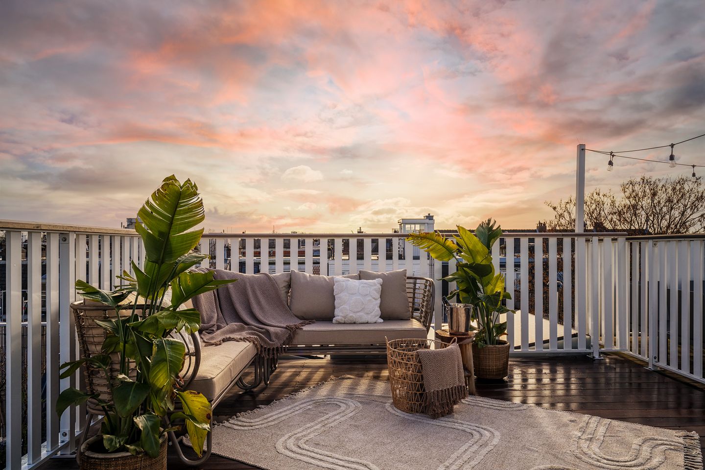 En de vaste trap naar het royale dakterras! Hier is het heerlijk toeven van de vroege ochtend tot de late avond, midden in de stad!