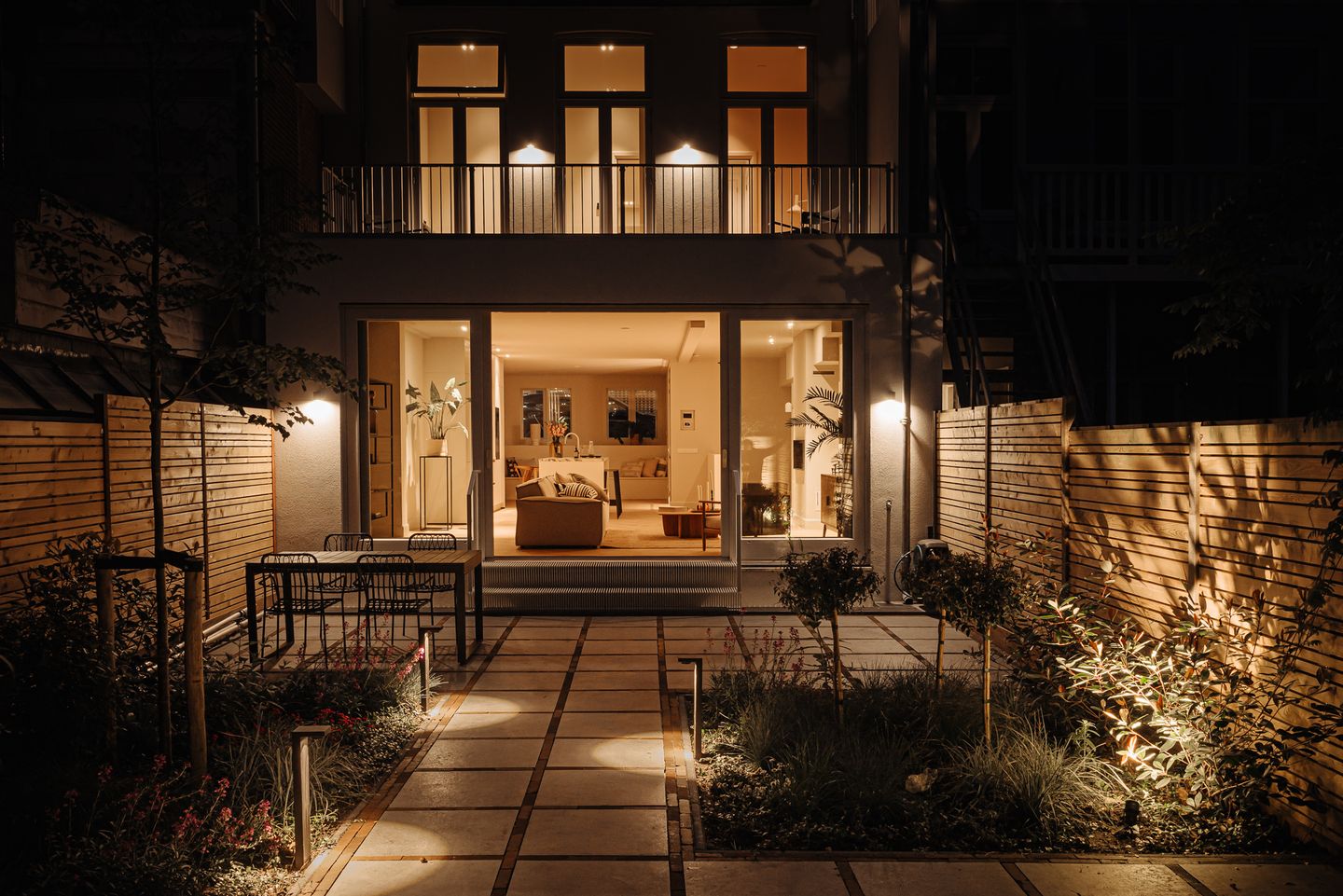 The garden is landscaped under architecture with lots of greenery and a spacious dining table and seating area. There is evening lighting and water supply.