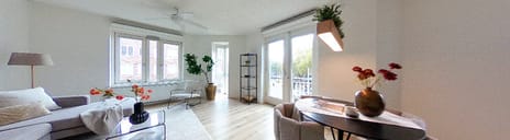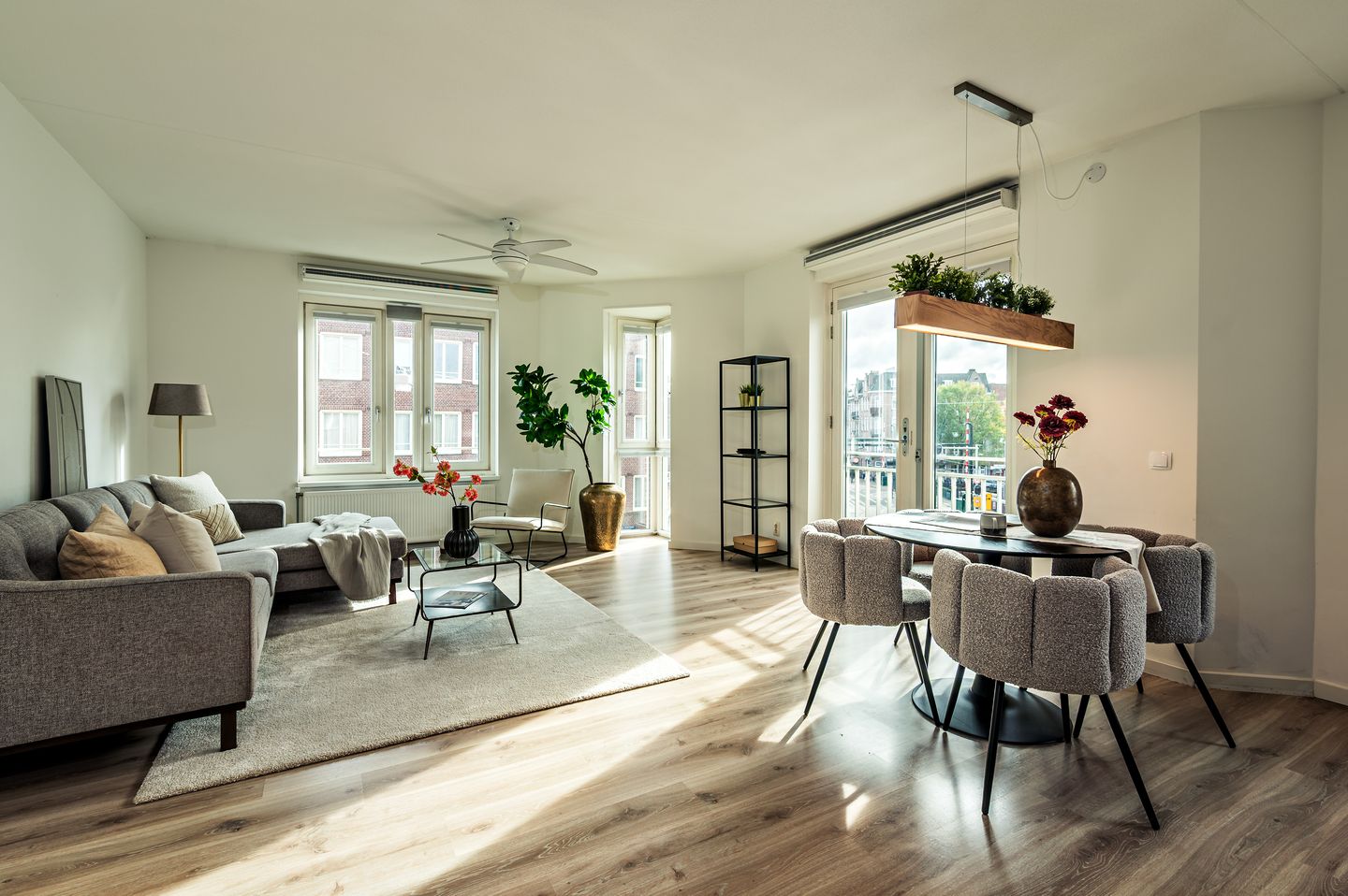 Bij binnenkomst valt direct de ruime en overzichtelijke indeling op. Vanuit de hal loop je de lichte woonkamer in, met ramen aan twee kanten waardoor de zon op elk moment van de dag naar binnen valt. Op de hoek van de kamer is een uitnodigend zitplekje bij het raam, een ideale plek om even doelloos voor je uit te staren en het dagelijkse Amsterdamse leven voorbij te zien trekken.