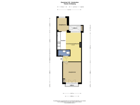 Entree appartement op de tweede verdieping, woonkamer/slaapkamer met balkon aan de voorzijde en slaapkamer met balkon aan de achterzijde, keuken en badkamer in het midden van het appartement. De badkamer heeft een douche, wastafel en toilet.