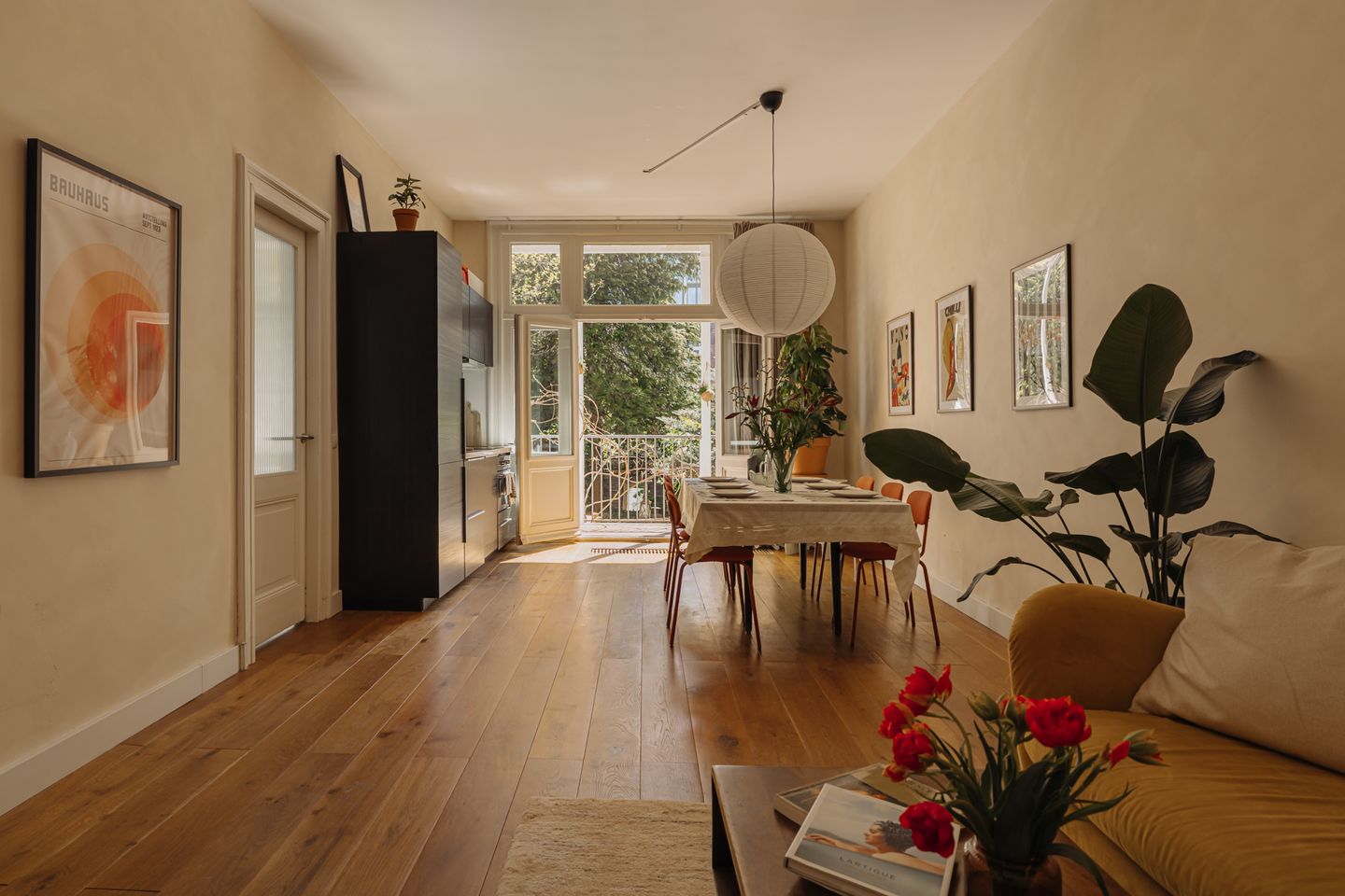 The living, seamlessly connected to the open kitchen, forms a balanced and light-filled whole. With a ceiling height of over three metres, a classic wooden floor, and French doors opening onto a secluded garden, the atmosphere is calm and inviting. The southeast orientation ensures morning and afternoon sun. At the rear, a compact room with direct access to the garden offers potential as a bedroom or studio. At the front, a generous suite with tall windows, original former en-suite layout, and enough space to sleep and work comfortably.