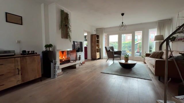 Via de voortuin bereik je de entree van de woning. In de hal bevinden het toilet, toegang tot de inpandige berging en de de woonkamer. De woonkamer is tuingericht en heerlijk licht dankzij de brede pui met openslaande deuren (2023) naar de achtertuin. De ruimte is opvallend groot en strekt zich uit over de volledige diepte van de woning. De open haard zorgt voor extra sfeer en maakt het een fijne plek om samen te komen.