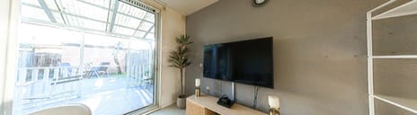 Je komt binnen in een ruime hal met garderobe, toilet en trapopgang. De lichte, tuingerichte woonkamer voelt ruim en comfortabel aan dankzij de grote raampartijen en het directe uitzicht op de verzorgde achtertuin.