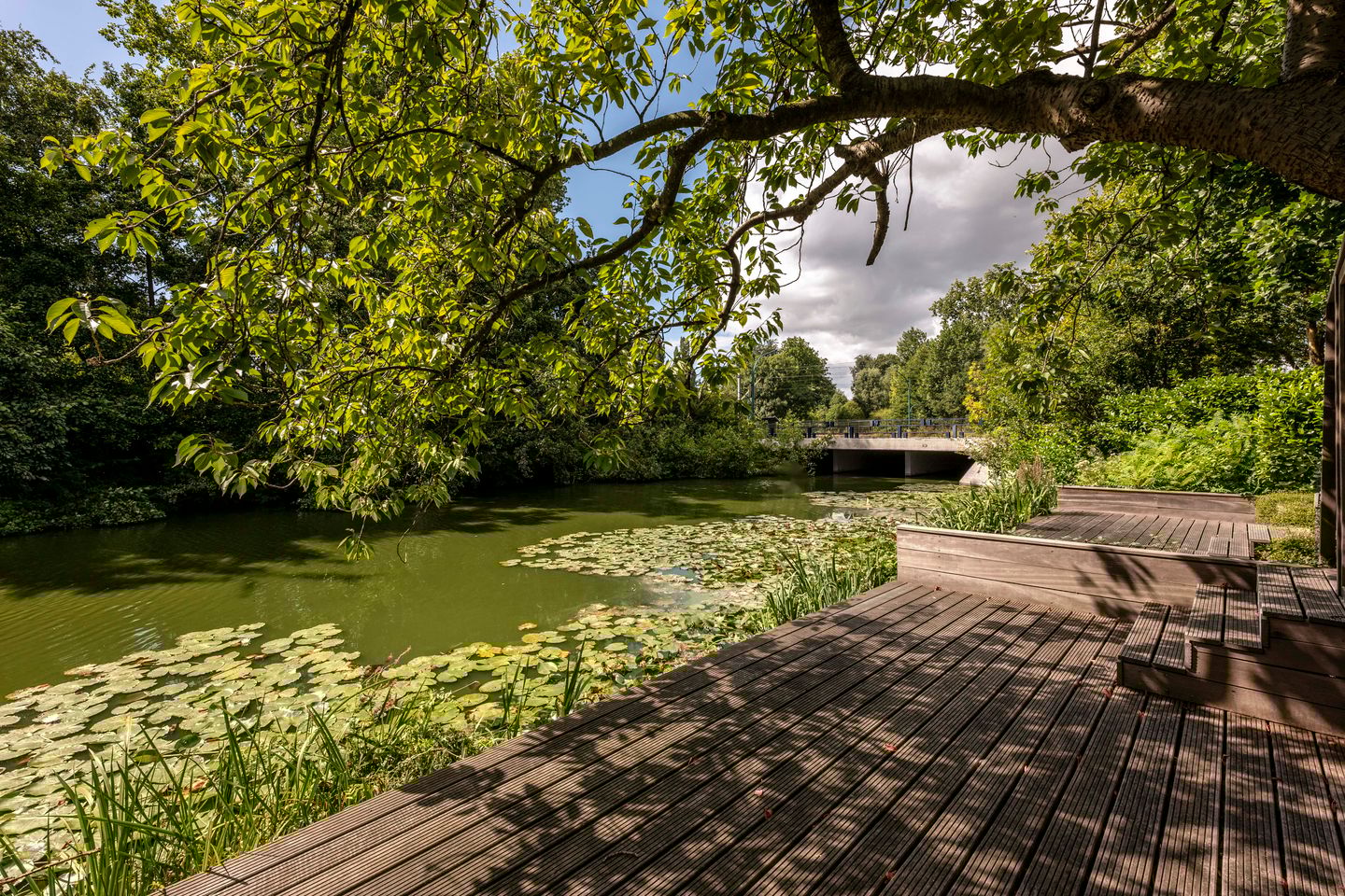 De zonnige achtertuin op het zuiden is een waar buitenparadijs. Dankzij de ligging aan water en groen geniet je hier van rust en privacy. De diepe tuin is perfect voor lange zomeravonden en gezellige barbecues met vrienden. Uniek is de eigen steiger aan het water – ideaal om een bootje aan te leggen of gewoon heerlijk te genieten aan de waterkant. Blikvanger is de grote kersenbloesem achterin de tuin, die in bloei niet alleen veel bewonderaars trekt, maar ook zorgt voor schaduw en privacy.