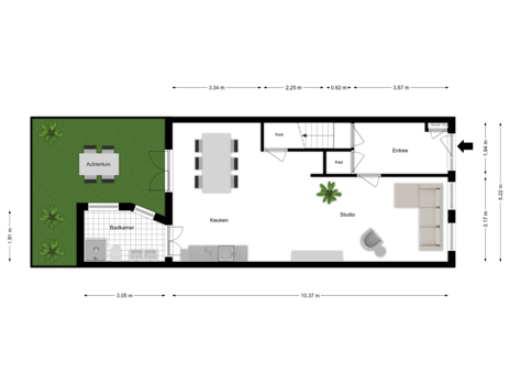 - 21 m² (4,06 meter diep en 5,22 meter breed)