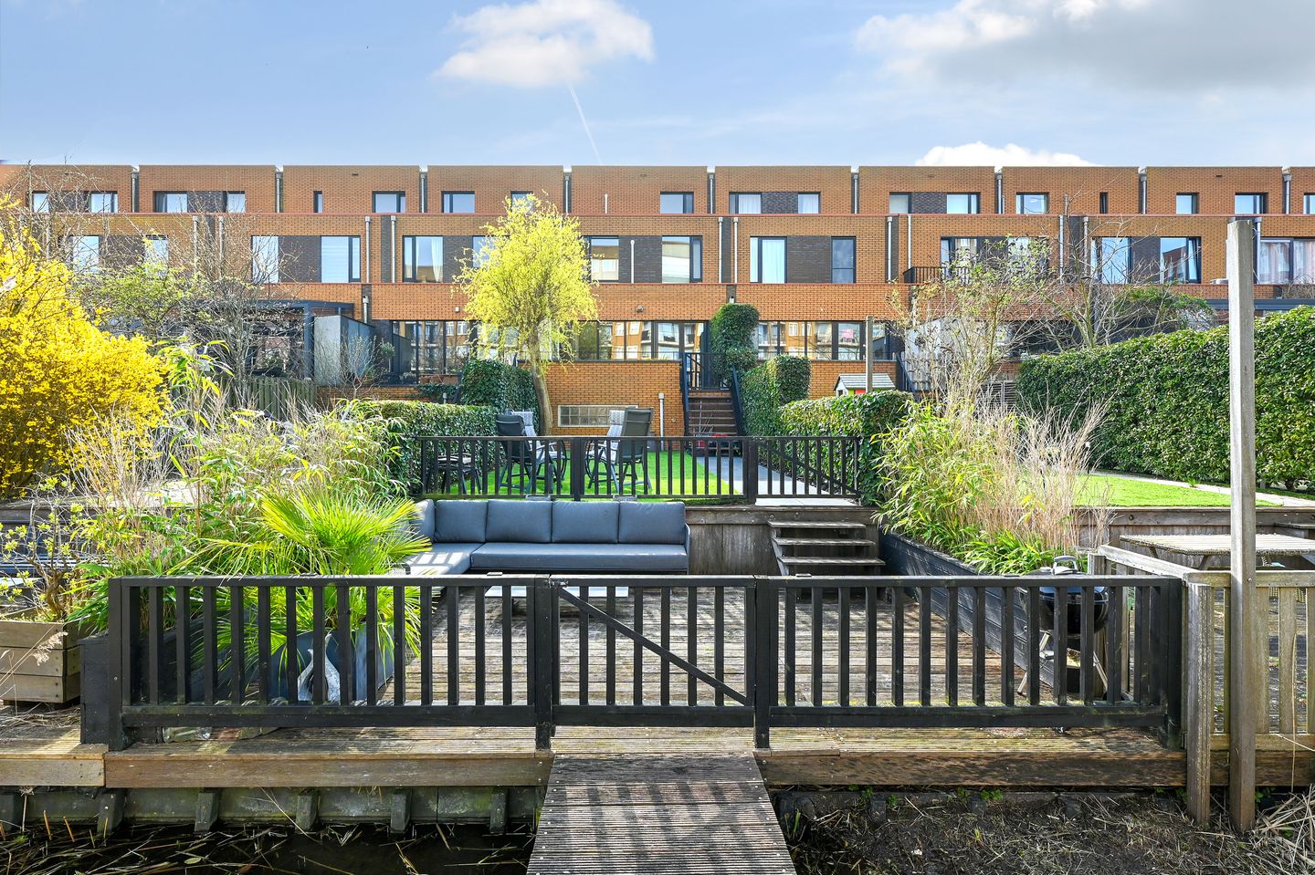 - Zeer grote tuin met veranda, prachtig aangelegd met eigen steiger aan het water. Door de diepte van de tuin is er altijd volop zon!