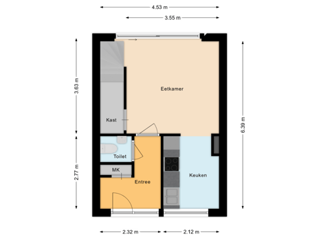 Via de entree bereik je de hal met separate toilet en toegang tot de eetkamer. De ruime, lichte eetkamer biedt direct uitzicht op de achtertuin en heeft een prettige indeling met voldoende plek voor een zit- en eethoek. De open keuken aan de voorzijde is voorzien van diverse inbouwapparatuur en heeft voldoende werk- en opbergruimte.