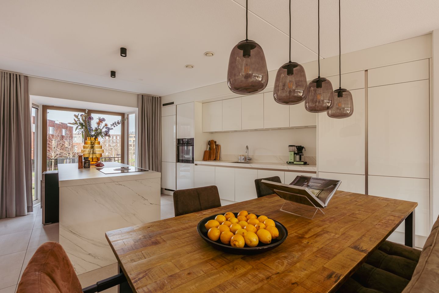 Via een kleine trap omhoog vind je de leefkeuken welke is voorzien van luxe inbouwapparatuur zoals een inductiekookplaat met ingebouwde afzuiging, oven, vaatwasser, wijnkast en koel/vries combinatie. Deze woonlaag is voorzien van een mooie tegelvloer en tevens is er een bijkeuken waar de wasmachine en droger opstelling is geplaatst.