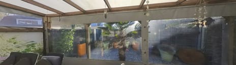 Tuin: aan de voorzijde is een tuin, langs het huis is een zijtuin op het westen. Achter de woning is een tuin met achterom op het zuiden. Aan de achtergevel is over de brede van het huis een houten overkapping gemaakt welke met pvc achterwanden waardoor je ook in de winter heerlijk buiten kunt zitten.