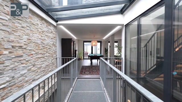 Via de oprit, met parkeergelegenheid voor twee auto’s op eigen terrein, bereikt u de entree van de woning. Bij binnenkomst bevindt zich aan de rechterzijde een praktische berging, ideaal voor extra opslag of het stallen van fietsen. Vanuit de hal leidt een vide met brug u naar de royale woonkamer, wat zorgt voor een ruimtelijk en architectonisch effect.