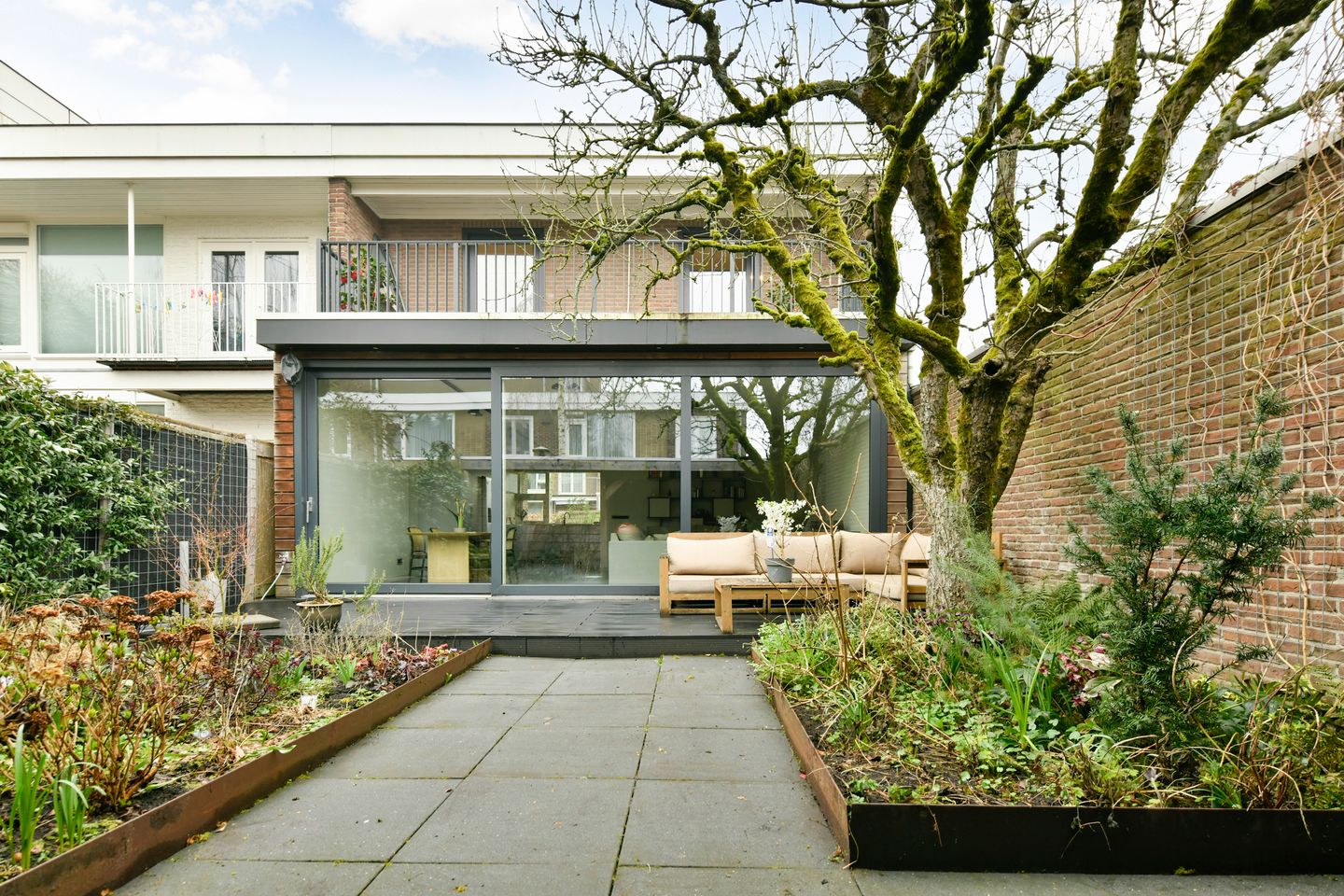 door hovenier ingerichte tuin met een houten terras grenzend aan het huis, een prachtige boom en beplanting. De tuin is met 14 m² uitgebreid. Op deze extra vierkante meters staat de houten berging voorzien van elektra en een overkapping voorzien van elektra. Er is een achterom (handig met de fietsen).