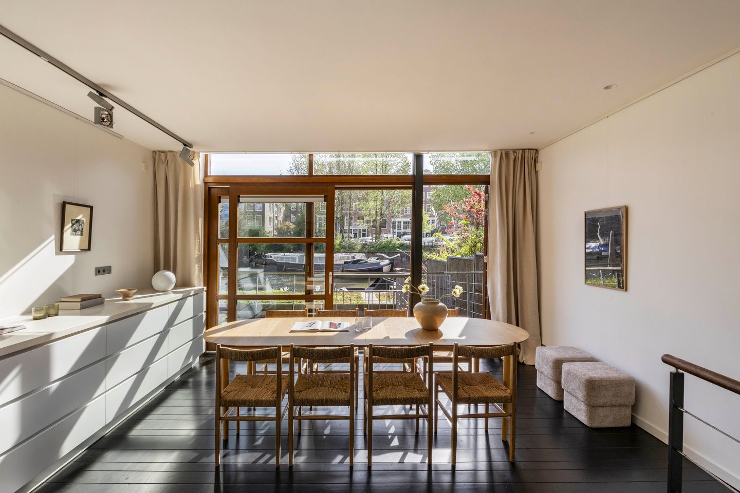 Vanuit de hal leidt een korte trap naar de woonkeuken met eetkamer. De ruimte is voorzien van een ruime, brede keuken en biedt voldoende plek voor een grote eettafel. In de woonkeuken kijk je uit over het water, het groene Sedum dak van de benedenverdieping. De woonkeuken staat in verbinding met het terras en de eigen aanlegsteiger. Het terras biedt voldoende ruimte voor een grote lounge en vormt het vertrekpunt naar het open water. Vanuit de Bickersgracht is het IJ en de grachtengordel direct bereikbaar.