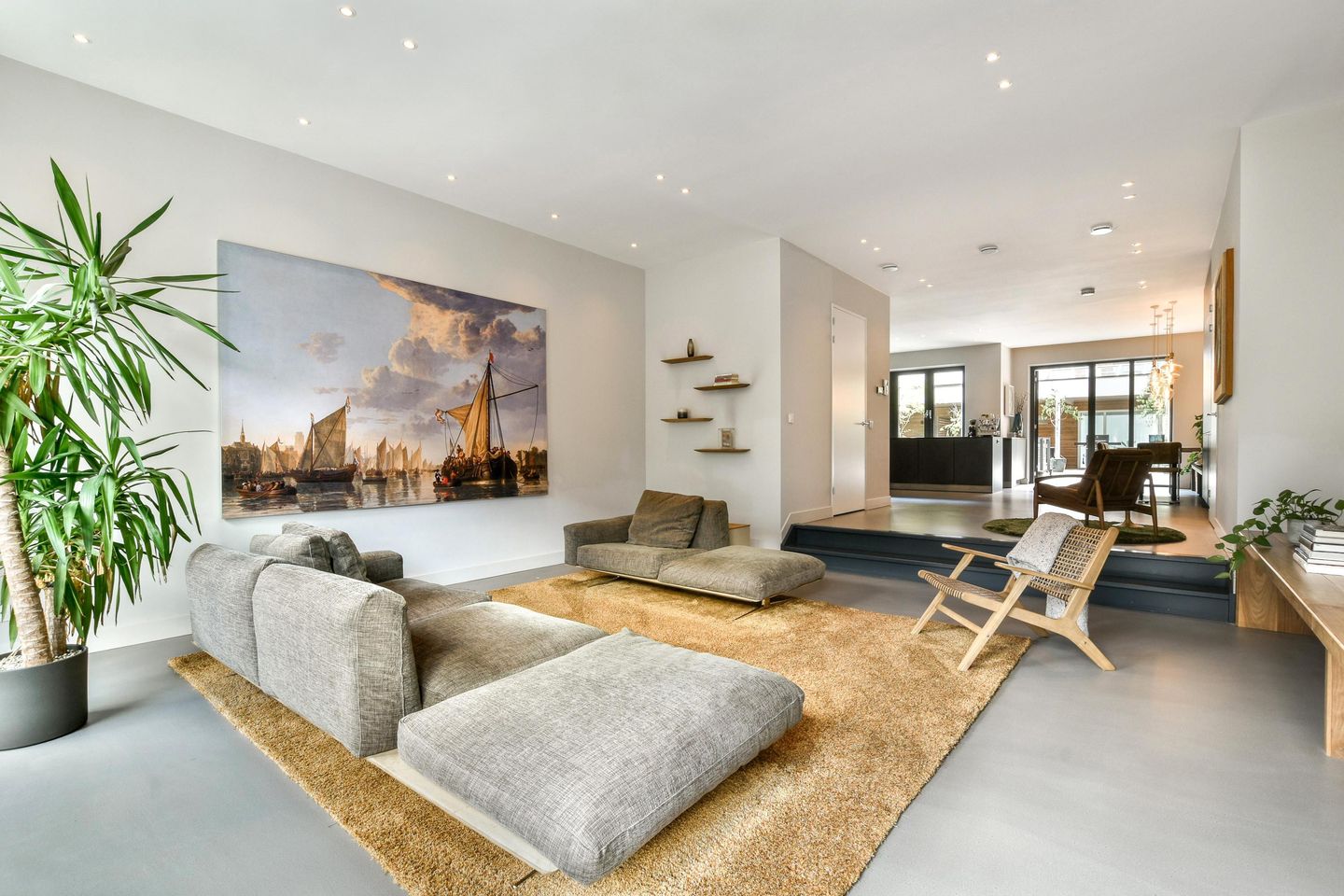 De living wordt op een subtiele manier door een trede onderbroken, waardoor de grote ruimte een knusser en intiemer gevoel krijgt. De open keuken is een echte eyecatcher en voorzien van hoogwaardige inbouwapparatuur, een kookeiland, veel opbergruimte en een koffiecorner. Aangrenzend aan de eetkamer ligt een fantastisch (dak)terras, waar je heerlijk kunt ontspannen en eten, ook tijdens dagen van minder mooi weer biedt de overkapping een uitstekend alternatief.